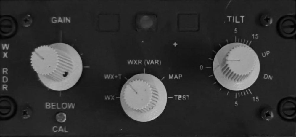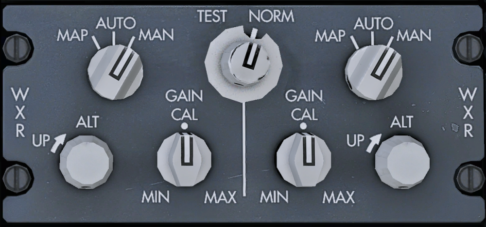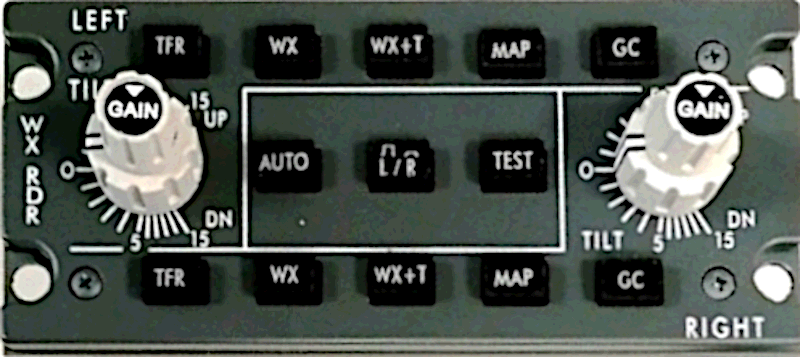 If you rotate the GAIN and TILT buttons on this panel, BOTH GAIN and TILT buttons in Zibo will rotate simultaneously. The mode dial in the center of the panel maps to the following settings in Zibo. Again, both the Captain's mode and the F/O's mode will be set synchronously: