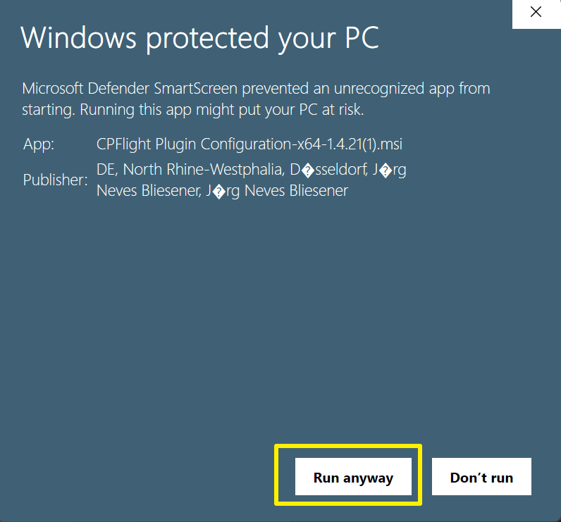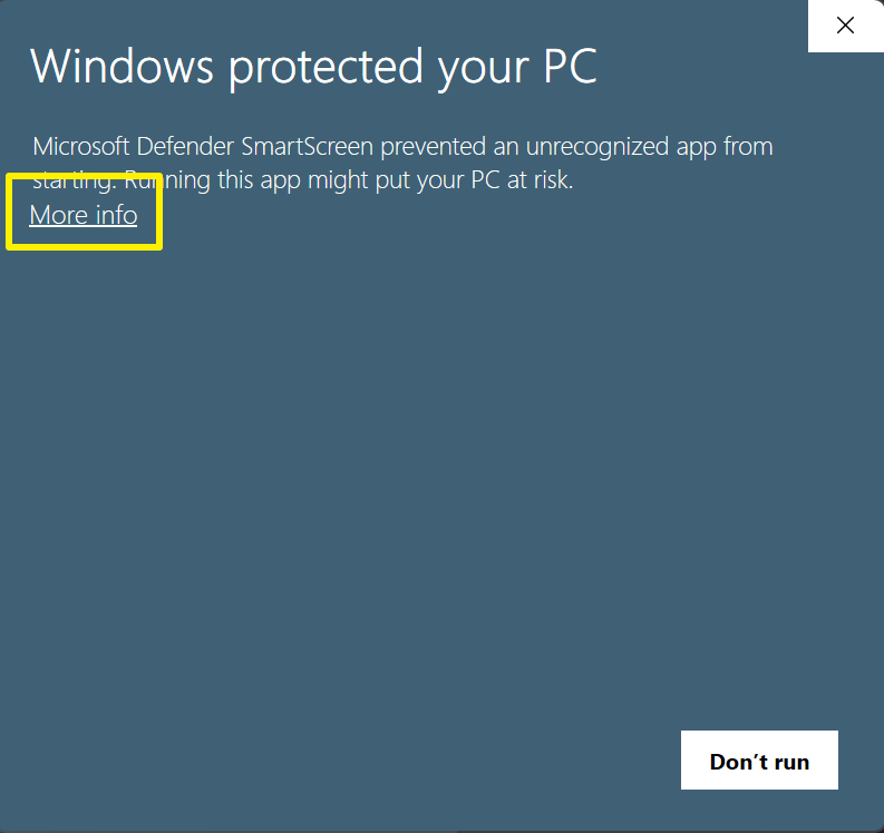 You may be able to download the Windows installer (.msi) file, but when trying to execute it, Windows may show a warning message that it "protected your PC". Again, this can happen if Windows does not yet recognize the app and you can verify on VirusTotal that the configuration software does not harm your computer. As with the browser download mentioned in the previous section, you can override the Windows "protection" by clicking on "More info":